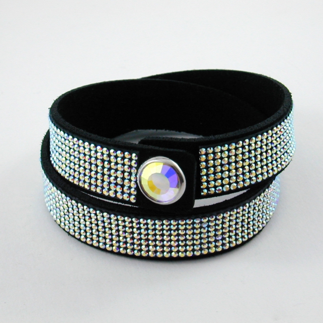 A longer version of our popular 'aura' bracelet; this sparkly Swarovski crystal encrusted ultra-suede bracelet wraps around the wrist twice, and does up by way of a Swarovski crystal snap.