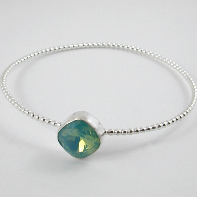 This unique bangle is crafted from sterling silver wire and a bezel set with a sparkly Swarovski crystal. So sparkly and fun to wear!