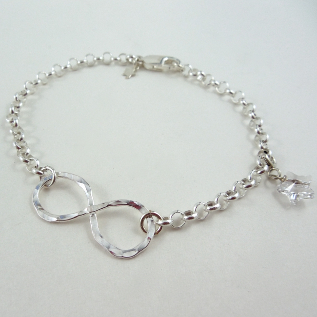 This hand-hammered sterling silver infinity symbol floats in a shiny silver rollo chain bracelet, and a magical Swarovski crystal star adds a touch of sparkle. To infinity and beyond!