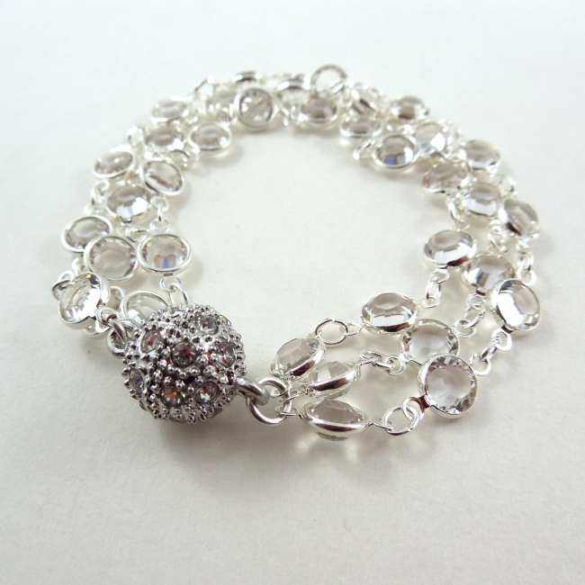 This amazing, three strand sterling silver and SWAROVSKI Elements crystal bracelet is the perfect adornment to your outfit. Guaranteed to sparkle and shine! Does up by way of a stunning magnetic ball clasp.