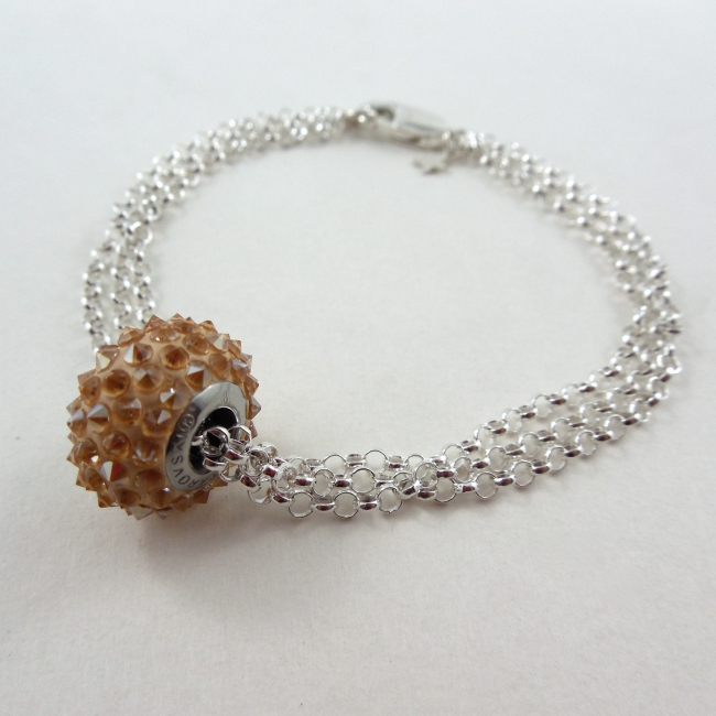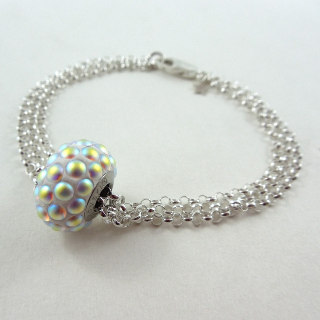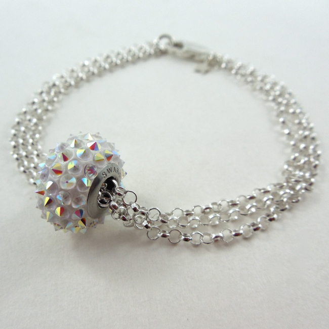 On this trio of silver chain bracelet floats an ultra cool Swarovski Elements pave spike or cabochon crystal bead. So funky!