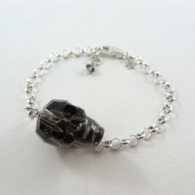 Definitely a funky bracelet - a sterling silver rollo chain bracelet featuring a shimmering Swarovski Elements crystal skull bead in a silver night color.