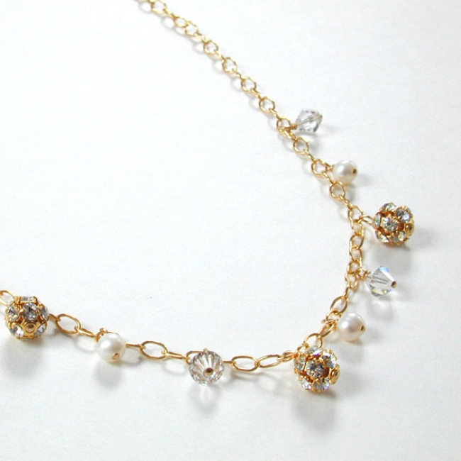 14k gold fill chain necklace with crystal balls, crystal bicones, and crystal pearl charms