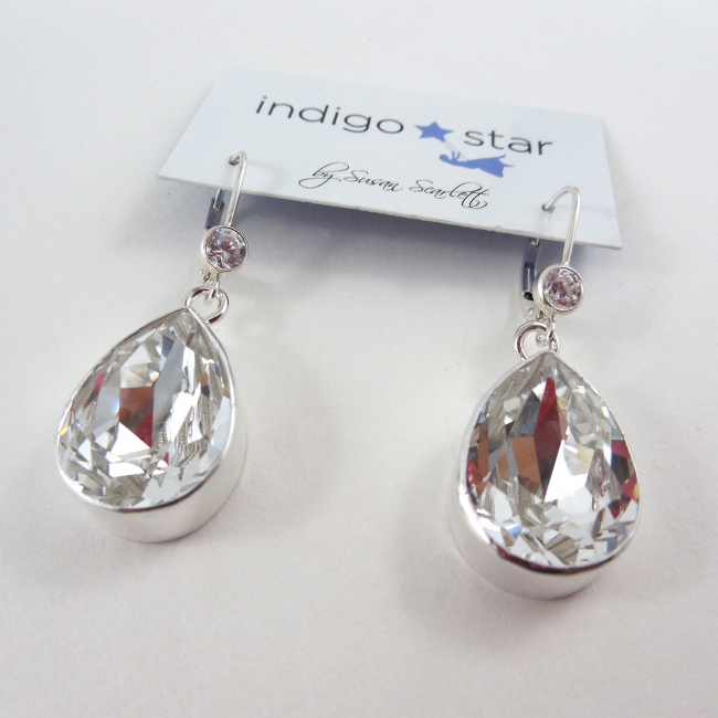 These magnificent pear shaped crystals in clear crystal are set in handmade sterling silver bezels and hang from silver ear levers that feature a crystal setting. Perfect bling for the big day!