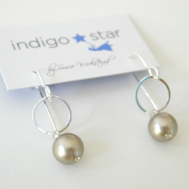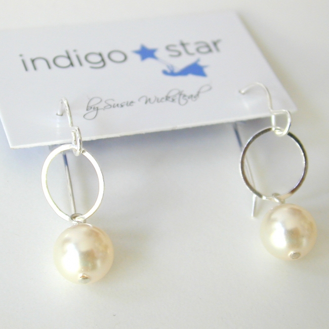 sterling silver flat round link with crystal pearl drop, on ear wire