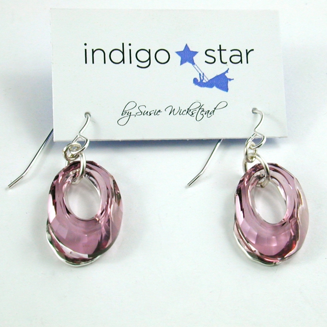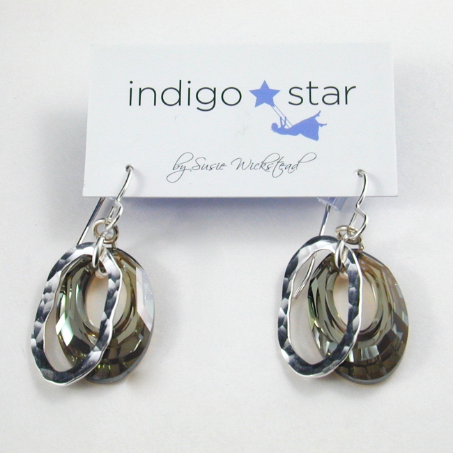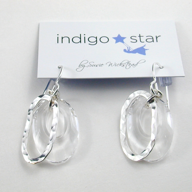 These earrings are top notch beauties! Featuring the new helios-shaped crystal and a hammered silver oval, they shimmer so perfectly on your earlobes!