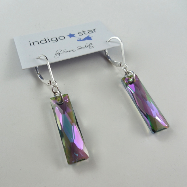 These shimmery earrings feature the new queen baguette shape in the beautiful color: crystal paradise shine. On sterling silver lever hooks.