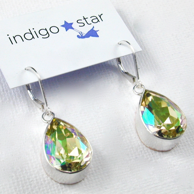 These magnificent pear shaped crystals in the new crystal luminous green color are set in handmade sterling silver bezels and hang from silver ear levers. Perfect bling!