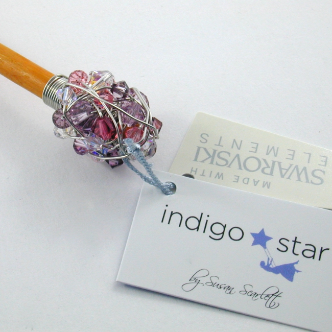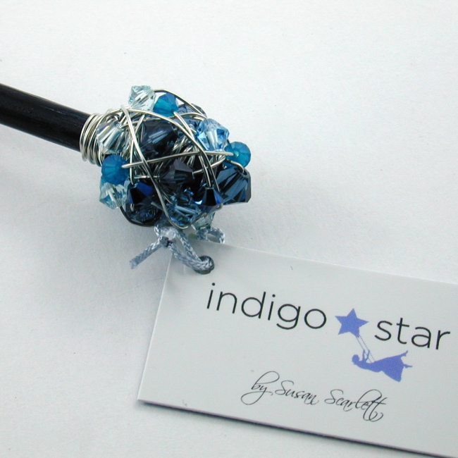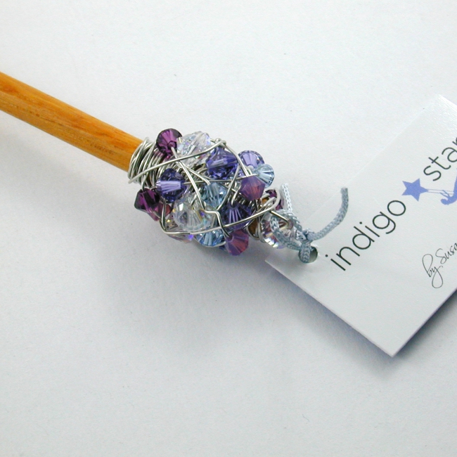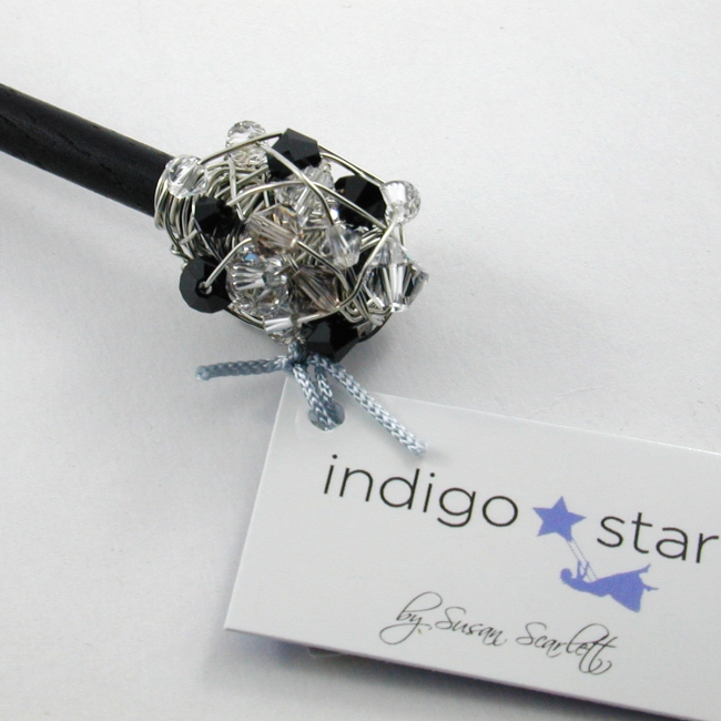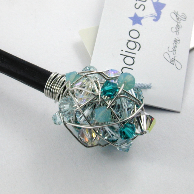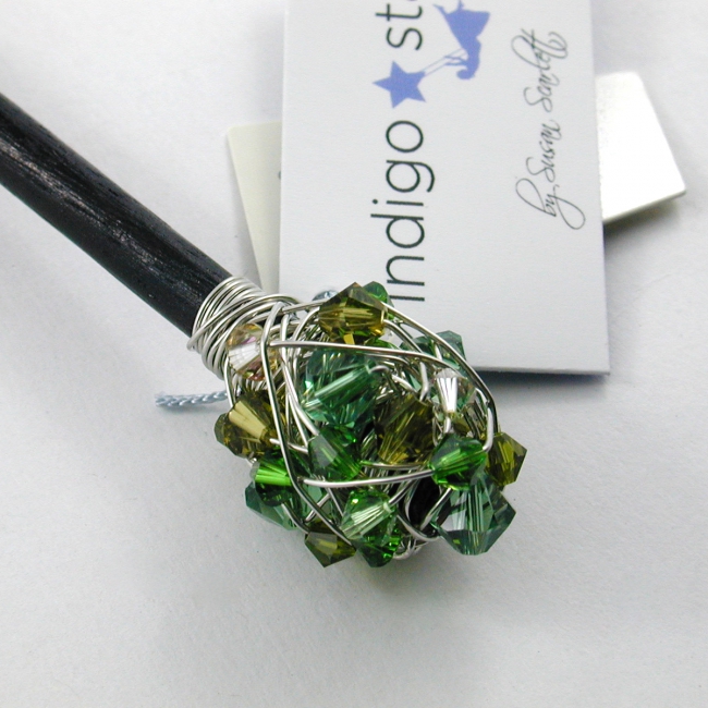 delightfully sparkly, these hand wrapped crystal clusters on a stick made a wonderful hair stick as well as a great way to close sweater wraps or ponchos!