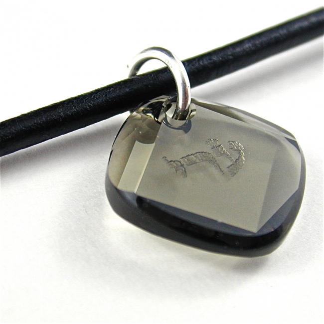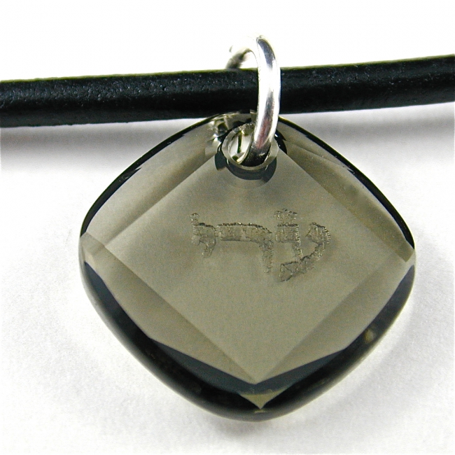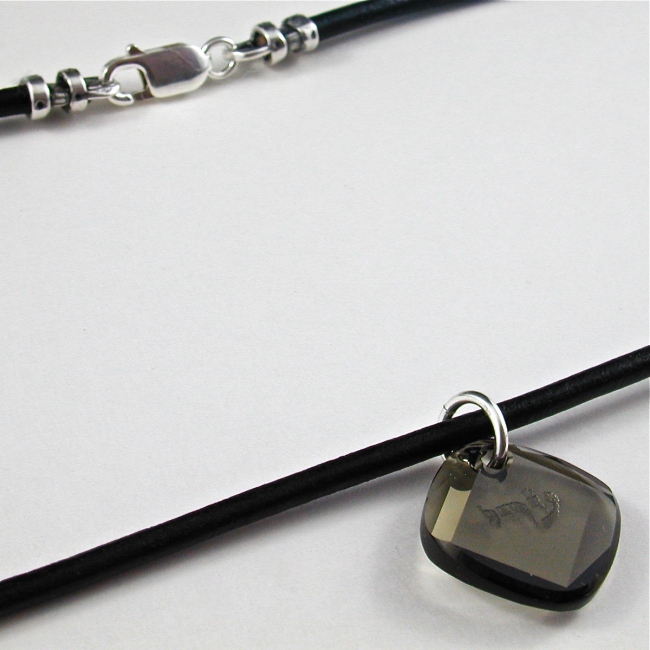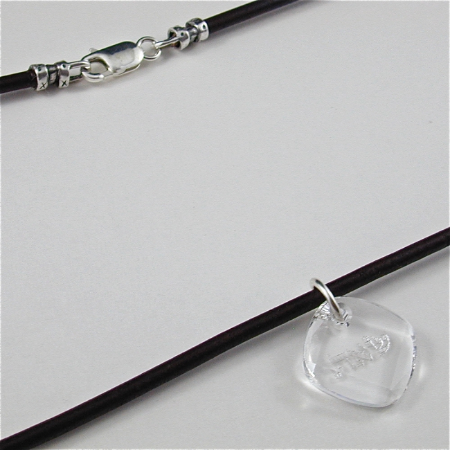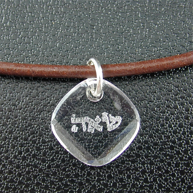 This leather and sterling silver unisex necklace features a Swarovski crystal metro pendant engraved with one of the hebrew 72 Names of God. It makes a great men's necklace. (Available in brown or black leather in any length).