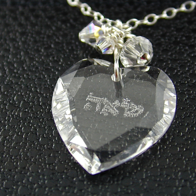 This sterling silver necklace features a Swarovski crystal heart pendant engraved with one of the hebrew 72 Names of God, and a cluster of tiny crystals.