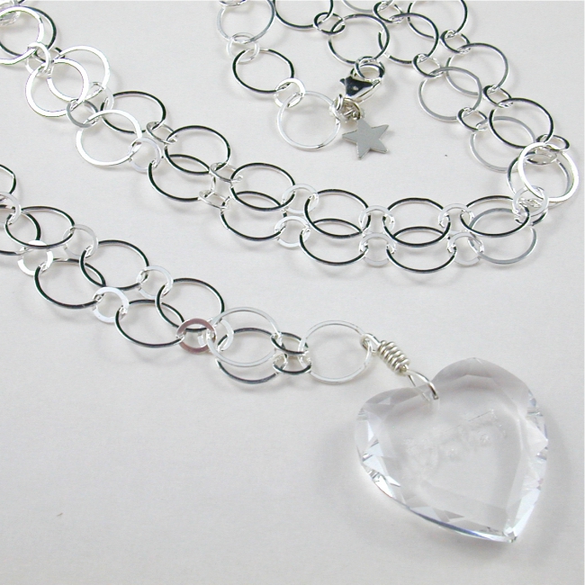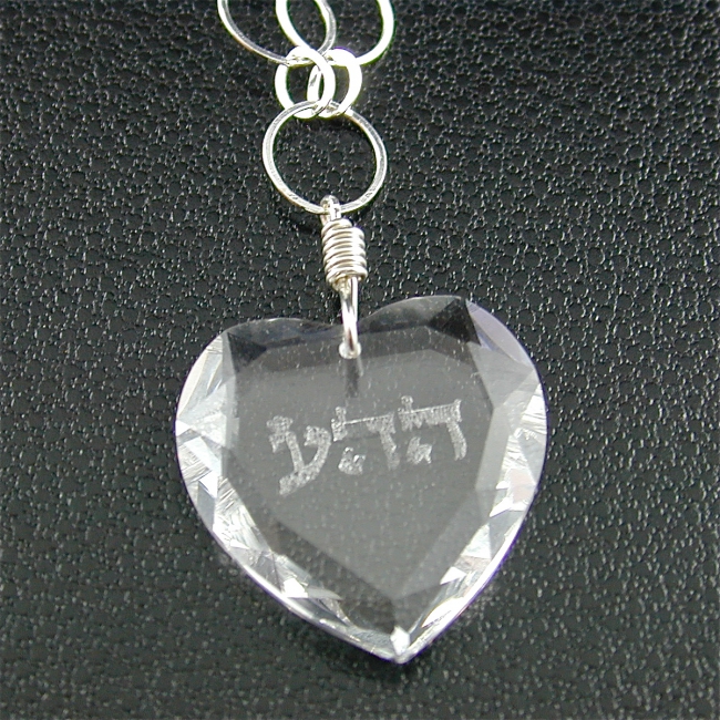 This long sterling silver necklace features a giant Swarovski crystal heart pendant that has been engraved with one of the hebrew 72 Names of God. ('Unconditional Love' shown here).