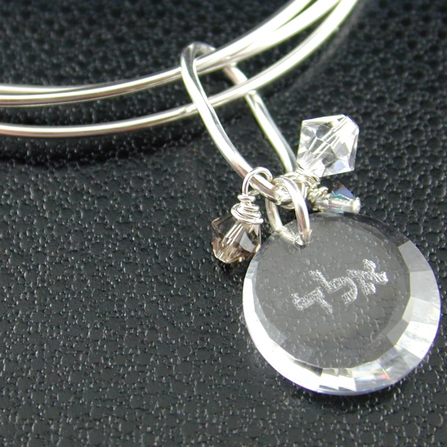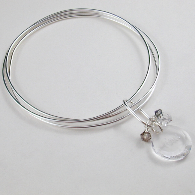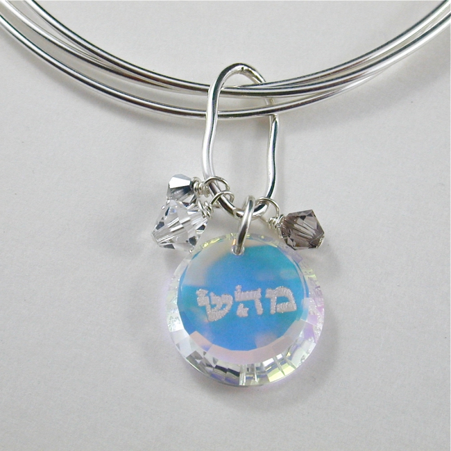 This sterling silver triple bangle bracelet features a Swarovski crystal circle charm engraved with one of the hebrew 72 Names of God, and a grouping of tiny crystals.