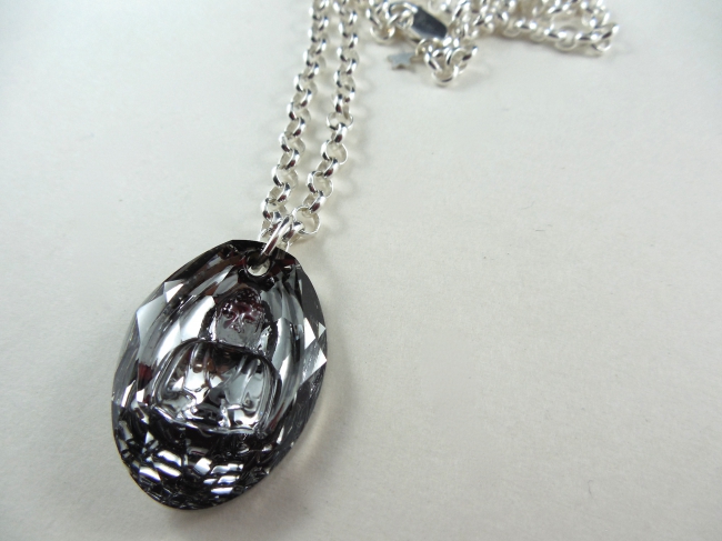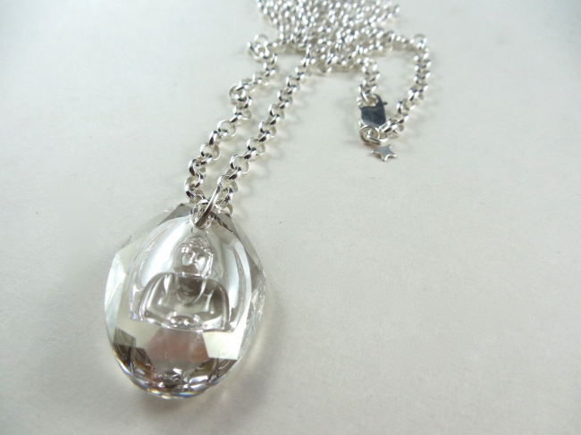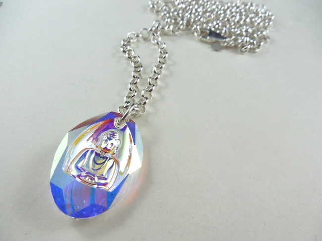 This amazing Swarovski crystal buddha pendant is absolutely stunning! Hangs on a long (28mm) sterling silver roll chain necklace.