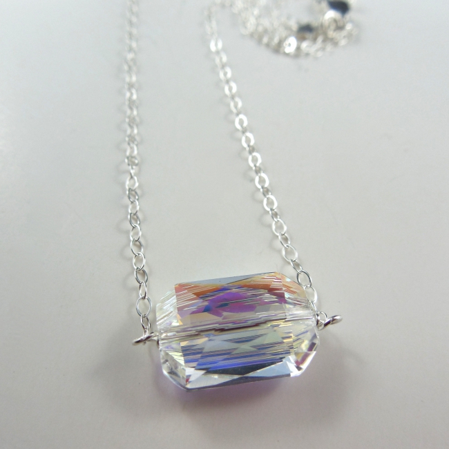 This simple necklace features an emerald-cut Swarovski crystal centred in a sterling silver chain.