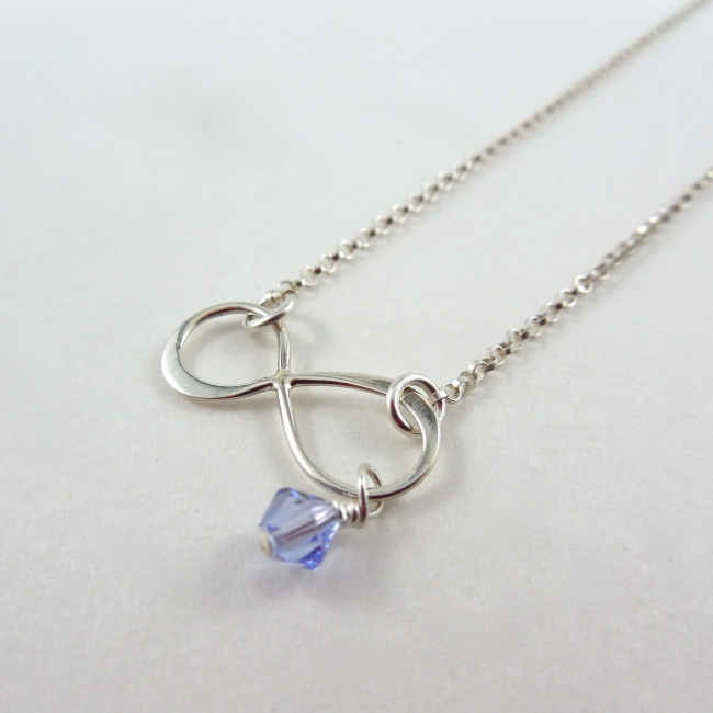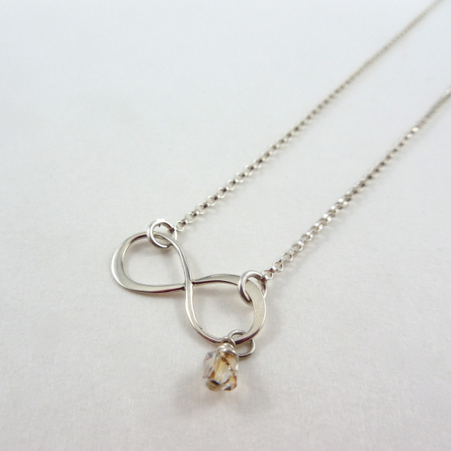 This beautiful infinity symbol is suspended in a delicate silver rollo chain necklace; and a sparkly Swarovski crystal dangles perfectly from it.