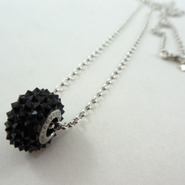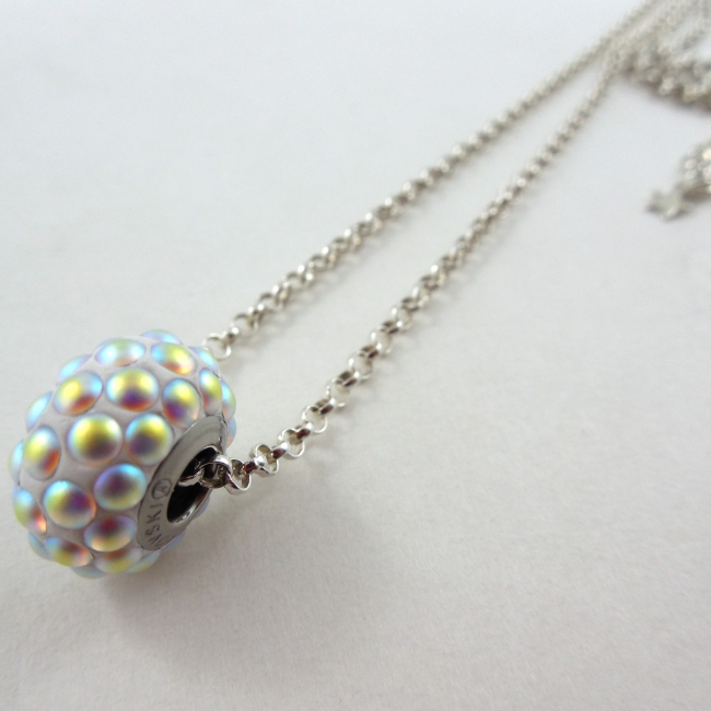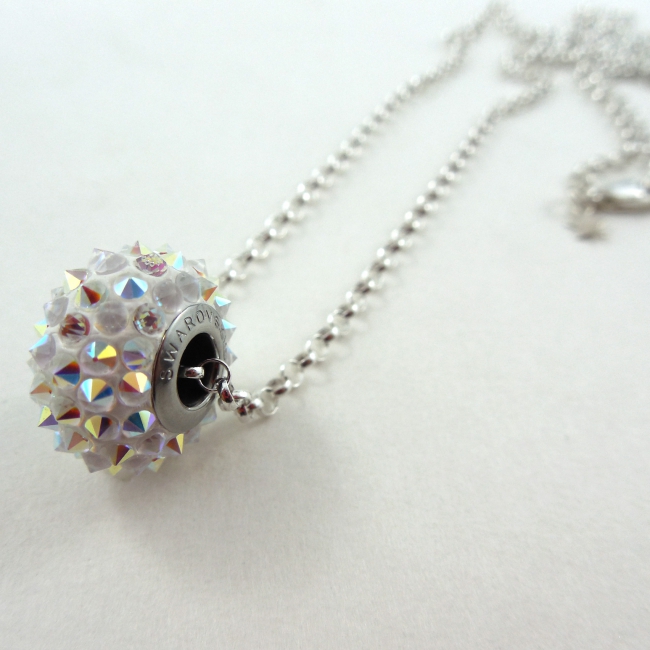 These pave spiked ULTRA cool Swarovski Elements Be-Charmed Beads float on a long silver necklace (30 inches).