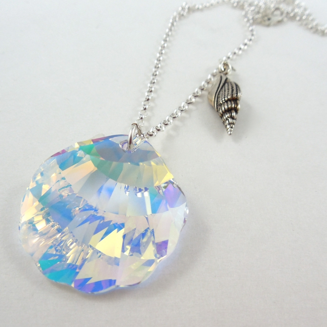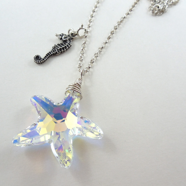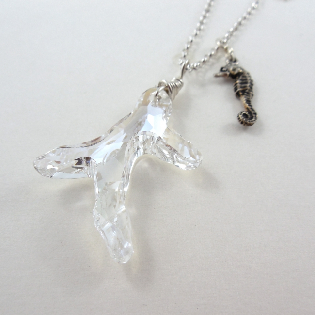 This shimmery Swarovski Elements crystal sea-inspired necklace is a dazzler. It hangs perfectly from a sterling silver necklace adorned with a little sea horse charm. Available in seashell, coral sprig, or starfish shapes.