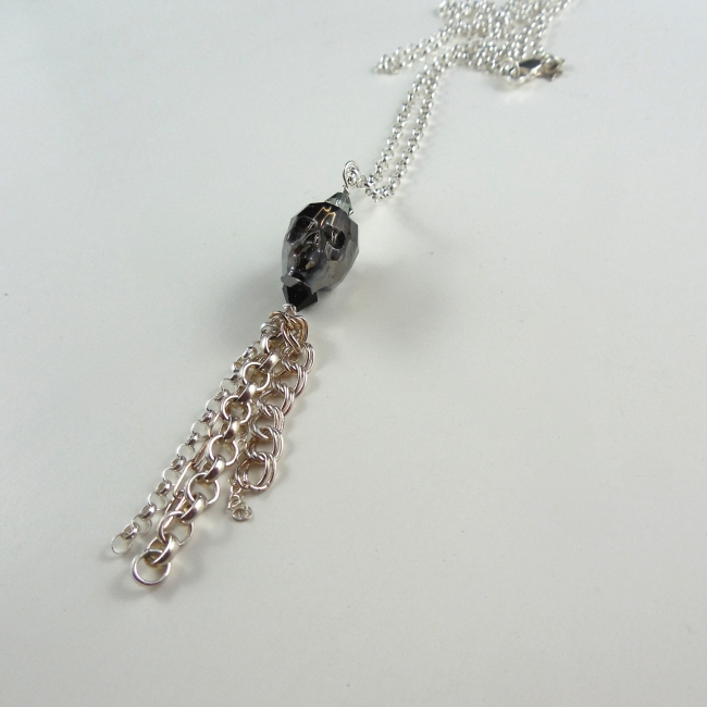 This 30 inch silver necklace features a Swarovski Elements crystal skull, and a tassel of silver chains compete the funky look!