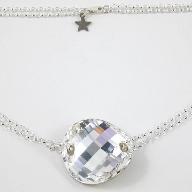A Swarovski Elements crystal twist pendant centered in a double sterling silver rollo chain necklace. Simply stunning!