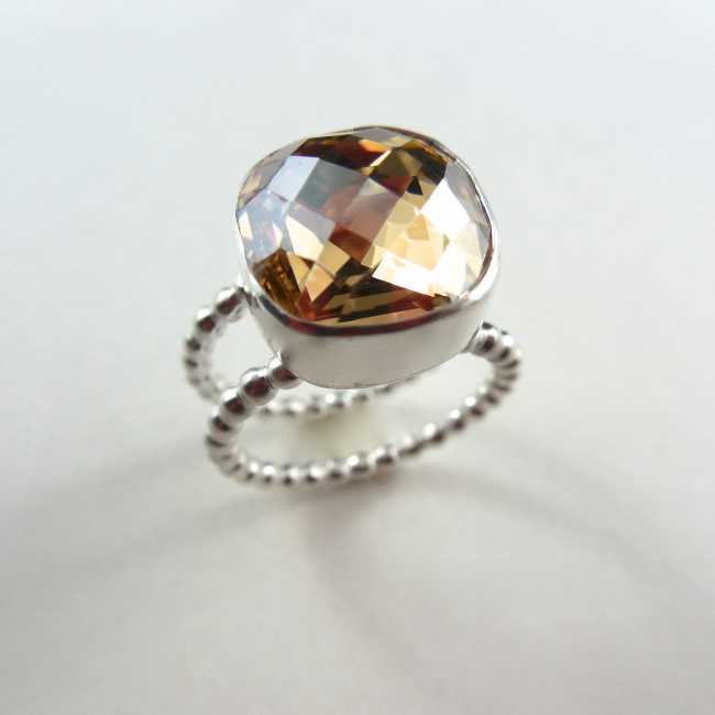 This shine-filled Swarovski Elements square crystal is hand set into a sterling silver bezel on a double beaded band. The result - one unique ring! (shown in golden shadow)
