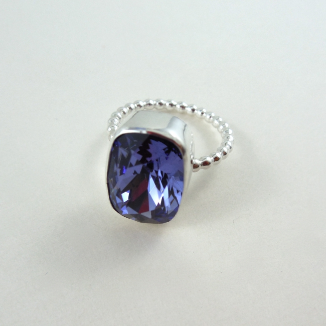 This stunning ring is crafted from sterling silver and features a gorgeous Swarovski Elements cushion crystal in the color tanzanite. Wow!